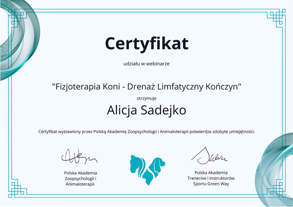 Kurs powięziowej terapii manualnej u koni, skończyłam w 2022 roku (przed zmianą nazwiska na Sadejko).